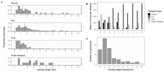 Graphs showing variation in use of different transport models and distances travelled from home to plot by allotment gardeners (n = 158). (A) Distribution of journey lengths for each transportation type (bicycle, car, foot and public transport); (B) distribution of transportation type for each km travelled; (C) distribution of distance travelled by participants, not split by transportation type.