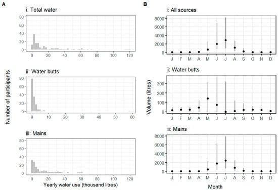 Water use by allotment gardeners (n = 149) over the course of a year. (A) Total water use, water from water butts, and water from mains supply. Dashed lines indicate the median water use, for (i) 7595 L; (ii) 486 L; and (iii) 5993 L. (B) Monthly median (points) and interquartile ranges (lines) of litres of water used on allotments from water butts, mains water, and all sources.