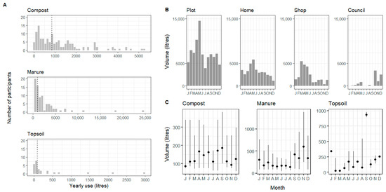 Use of compost, manure and topsoil by allotment gardeners (n = 155). (A) Distribution of yearly use (litres) of compost, manure and topsoil with dashed lines indicating the median use of each resource. (B) Monthly total use of compost split by source (plot, home, shop or council). (C) Monthly median (points) and interquartile ranges (lines) of compost, manure and topsoil additions.