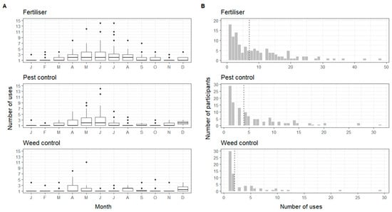 Fertiliser, pest control and weed control use on allotments (n = 162). (A) Monthly median and interquartile ranges of number of days on which fertilisers, pest control measures and weed control measures were applied (B) Distribution of number of days in the year on which fertiliser, pest control and weed control were applied. Dashed lines indicate median number of uses.