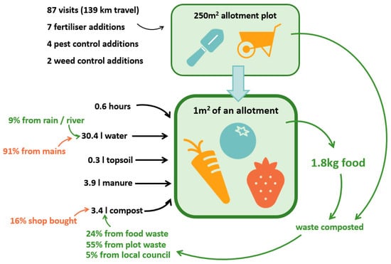 The above results allow us to estimate the average yearly resource use on allotment gardens per metre squared at the whole plot scale (i.e., including both cultivated areas and other infrastructure, such as paths—see earlier discussion in Section 2).