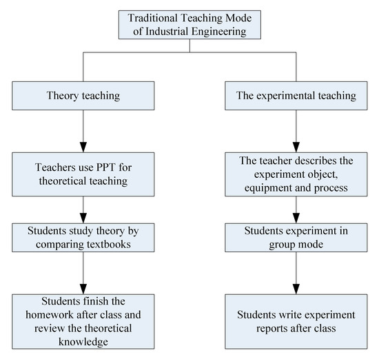 However, traditional industrial engineering teaching tends to concentrate on the teaching of theoretical knowledge and neglect the cultivation of practical ability, leading to the situation that many students have rich theoretical knowledge and weak practical ability [32]. Traditional industrial engineering teaching is mainly divided into two aspects: classroom teaching and experimental teaching. In class teaching, teachers generally make presentation slides (PPT) with knowledge points in the textbook, interspersed with some pictures or videos, and occasionally ask questions to students. Students are in a passive learning state with low learning enthusiasm. Experimental teaching is generally for teachers to teach experimental methods and experimental precautions, grouping, and then students are working in the laboratory to conduct experiments. Students’ experimental methods are generally carried out according to the teacher’s explanation and seldom done actively. In addition, for the experiments conducted by proceeding groups, some members of the group were very enthusiastic, but some students showed a negative attitude and did not master the content of the experiment. Therefore, traditional industrial engineering teaching is not conducive to cultivating students’ hands-on, creative, and practical abilities. Figure 1 shows the traditional teaching mode of industrial engineering [32].