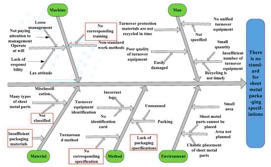 - Analyzing the key factors that cause problems with the existing packaging and turnover protection. Figure 4 shows the analysis conducted by the students using the fishbone diagram; the red boxes are the main factors. The students analyzed the reasons for the nonstandard packaging of sheet metal parts from five aspects of humans, machines, materials, methods, and the environment, and obtained the key factors leading to the packaging problems, which provided the direction for improving the design of the scheme.