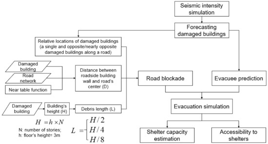 This research used results on seismic intensity prediction, forecasts of damaged buildings, and evacuees in Kanazawa City [9] as input data for the evacuation simulation. In more detail, the conventional method proposed by the National Research Institute for Earthquake Science and Disaster Prevention was applied to calculate seismic intensity and building damage was predicted based on the vulnerability function, which indicated a relationship between the ratio of damaged buildings according to different structural types, construction periods, and seismic intensity. The evacuee numbers, then, were forecast by considering the number of damaged buildings and the number of residents in those buildings [9]. In the present study, a method for road blockade prediction was presented by considering the relative locations of damaged buildings, distances between roadside building walls and the road center, and debris length from damaged buildings. Finally, evacuation simulations with and without considering road blockades were conducted to examine accessibility to shelters as well as shelter capacity. Figure 1 presents the flowchart of road blockade prediction and evacuation simulation with considering road blockades.