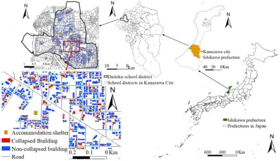 Daitoku school district is one of 62 school districts in Kanazawa City, Ishikawa prefecture, Japan (Figure 2). In this area, the numbers of damaged buildings and evacuees (Table 1) are predicted to be the highest among school districts according to a report on shelter capacity estimation [22] and Nguyen et al. [9]. Two main earthquake evacuation shelters exist in the area, Daitoku and Kibikino primary schools, along with several emergency shelters [9], which are parks in the case study. Notably, according to Nguyen et al. [9], Daitoku school district may be subjected to an earthquake with a Japan Meteorological Agency intensity of 6 (shindo 6 in Japanese).