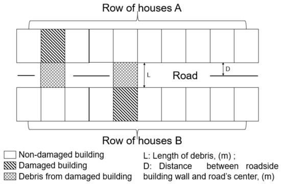 As represented in Figure 4, a road blockade will occur if the debris length of the damaged building is more than or equal to two times the distance between the roadside building’s wall and the road’s center (Equation (4)). This case can be seen in real life when the road is narrow and adjacent to damaged buildings or the damaged buildings are tall.