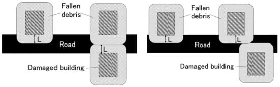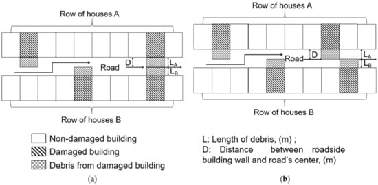 Figure 5 shows examples of relative locations of opposite or nearly opposite damaged buildings that can cause a road blockade after an earthquake. Concerning these damaged buildings, a road blockade occurs if the total debris length from the two damaged buildings is more than or equal to two times the distance between the roadside building’s wall and the road’s center (Equation (5)).