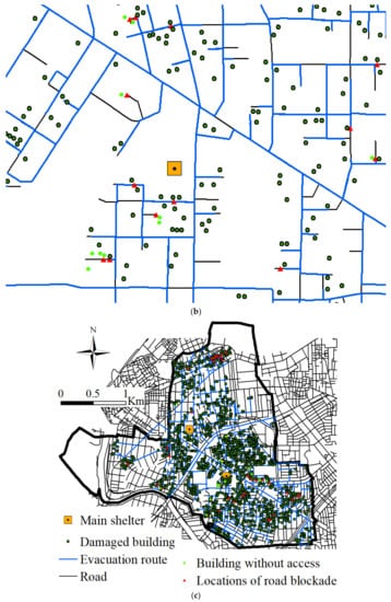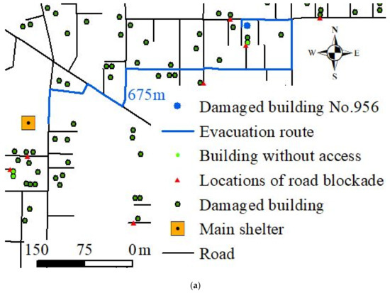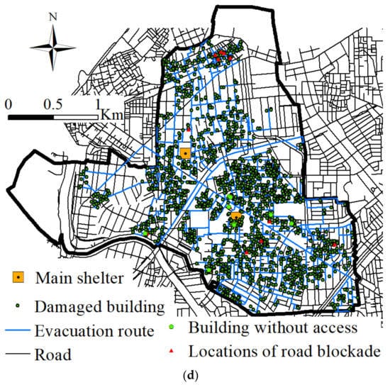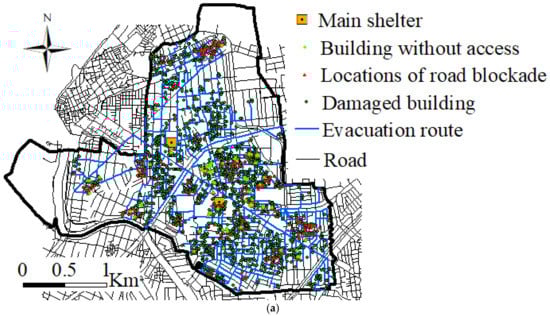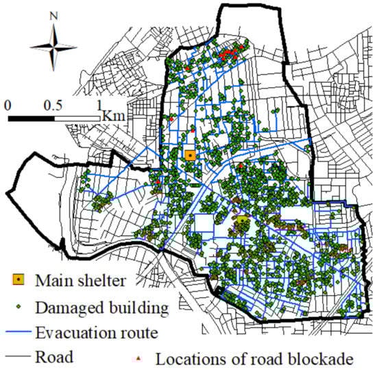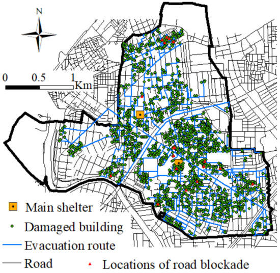 From the above analysis, many residents encounter road blockades caused by debris from damaged buildings during an earthquake, which means they cannot find a route to the main shelters or must travel longer distances to shelters.