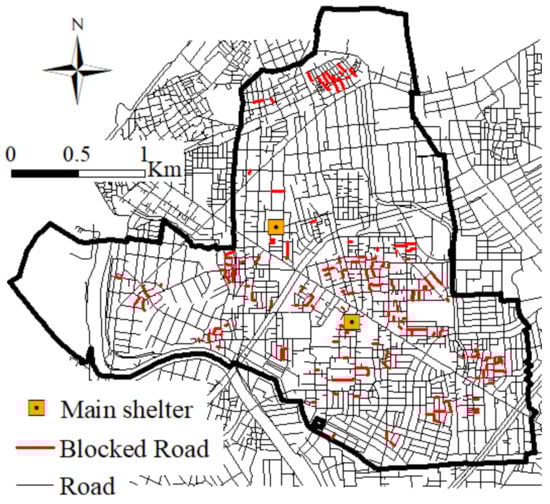 “A mega-disaster will result in an enormous number of evacuees staying in evacuation centers for a significant long time”; this quote was taken from a lesson learned from the Great East Japan Earthquake 2011 [1]. As reported from that event, more than 470,000 people were evacuated to more than 2400 shelters and the region faced difficulties with goods deliveries to affected areas because of damaged roads [1]. Experiences from past earthquakes show that road blockades caused by debris from damaged buildings in urban areas prevented evacuees from moving to shelters. Therefore, in earthquake-prone countries like Japan, because “large earthquakes can happen anywhere at any time” [2], estimating the impact of a potential earthquake as well as shelter capacity, which refers to the number of evacuees that can be accommodated, is necessary and important for disaster damage mitigation. Accordingly, many evacuation models [3,4,5,6,7,8,9,10,11,12] have been developed and are useful tools for disaster managers for reviewing current evacuation strategies and estimating whether shelters can provide accommodation for all evacuees. However, evacuation models that integrate road blockades are limited in the literature. Since the current evacuation models do not consider road blockades, which means all obstacles on the roads leading to the shelters are ignored, these models cannot realistically simulate residents’ evacuation to shelters.