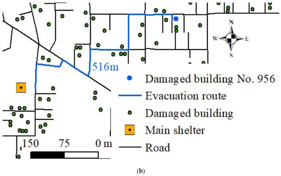 Evacuation route from damaged building No. 956 to a shelter under earthquake (a) and normal conditions (b).