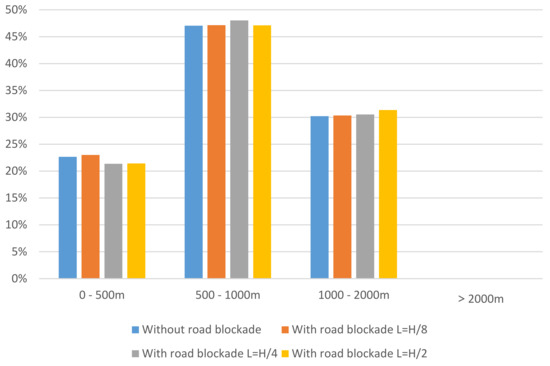 Percentages of damaged buildings at each distance category under earthquake conditions (with considering road blockades) and in normal conditions (without considering road blockades).