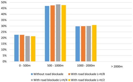 Based on simulated results of evacuation distance that evacuees have travelled, four distance categories (0–500 m, 500–1000 m, 1000–2000 m, and over 2000 m) were considered to examine accessibility from evacuees’ houses to main shelters under earthquake and normal conditions. According to the results, the number of evacuees who had to travel less than 500 m to the main shelter decreased under the earthquake condition compared with the normal condition. In the earthquake condition, more locations of road blockades meant fewer evacuees. There are several reasons for these observations. Firstly, due to road blockades, many residents have to choose longer routes without road blockades instead of the shortest route to reach the main shelters (Figure 13). Secondly, many evacuees do not have access to main shelters (Figure 14) and more road blockades mean more people from damaged buildings do not have access to main shelters. In distance categories of 500–1000 m and 1000–2000 m, the number of evacuees increased under the earthquake condition compared with the normal condition, as well as in three varied cases of earthquake condition. Finally, the percentage of evacuees living in a distance category of over 2000 m did not change much across all conditions and cases. Figure 15; Figure 16 present the percentages of damaged buildings and evacuees according to the four distance categories.