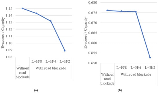 Furthermore, results of the numbers of evacuees at each main shelter, which are represented in Table 4, show that because some damaged buildings do not have access to main shelters due to road blockades, the number of evacuees at main shelters under an earthquake condition is less than that in a normal condition. Moreover, under an earthquake condition, a greater number of damaged buildings that do not have access to main shelters means there are fewer evacuees at main shelters. Along with a decrease of evacuees at main shelters, a ratio between the number of evacuees and planned capacity also decreased (Table 4 and Figure 17). The ratio between the number of evacuees and planned capacity at each main shelter shows that the number of evacuees at Daitoku primary school is over the planned capacity under an earthquake condition as well as a normal condition, which indicates this shelter’s capacity is insufficient. Kibikino primary school’s capacity is sufficient because the number of evacuees is less than the planned capacity. Therefore, excess evacuees at Daitoku primary school can go to Kibikino primary school for evacuation.
