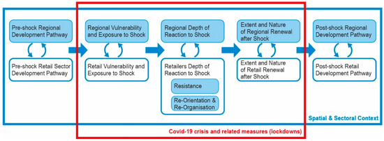 Research on the COVID-19 crisis and the implications for regional resilience is also still in its early stages [5]. Within urban regions, retail constitutes a major economic contribution and has significant societal and functional importance. As such, retail resilience can be seen as an important component for regional recovery [6] during and after crises. We contribute to existing research by analysing individual retailers’ resilience in times of the crisis initiated by measures responding to the COVID-19 pandemic in Germany beginning March 2020 and interpreting their effect on the resilience processes of the region. The focus on retailers makes sense as in addition to the disruptive changes that challenge their resilience and adaptability in the era of the COVID-19 pandemic, structural changes of recent years prevail, confronting retailers with short- as well as long-term hurdles. With approximately 410,000 small and medium-sized enterprises, around three million employees and an annual turnover of almost 500 billion euros, the retail sector represents the third largest industry in Germany [7]. The current COVID-19 pandemic, declared by the World Health Organization on 30 January 2020, led to two government sanctioned lockdowns in Germany (beginning 17 March as well as 16 December 2020) and elsewhere, whereby over 200,000 brick and mortar stores were not allowed to open their doors for customers [8], consequently, placing an enormous burden on many retailers. Despite the first easing of restrictions for the retail sector on 20 April, social distance rules, restrictions on the number of people and requirements to wear facemask still applied until the second lockdown in mid-December 2020, which was caused by the second wave of infections. Due to a number of long-lasting structural changes occurring in the retail industry, such as, inter alia, internationalisation, market concentration, digitalisation as well as changing consumer behaviours and demands, it has to be assumed that the COVID-19 crisis will contribute to an increase in the number of insolvencies. Retail locations are threatened by low retail vacancy rates and an increasing desolation of inner cities, which can lead to trading down effects [9], having negative impacts on the (commercial) quality of locations. Yet, a crisis affects different actors, including states and regions to varying degrees, as their reactions to the crisis differ considerably. While some emerge stronger, others face setbacks in their development, and yet others seem to be hardly affected [10] (p. 1). To intervene with trading down effects and to envisage sustainable development for future retail locations and urban centres, the dynamics can be described in terms of short-term resilience.