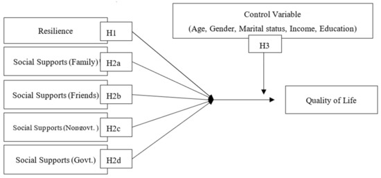 As a mediating variable, SS is regarded as a surviving resource that is commonly associated with encouraging adaptation and wellbeing in different classes of people, and even disaster survivors are an excellent example of this study [56]. Moreover, support from society was certainly related to the quality of life among the Chinese rural elderly (aged 60 and above) [17]. Besides, it had an indirect influence on the quality of life through resilience [17,21,42]. Resilience also somewhat mediates the connection between the quality of life and SS among the rural Chinese elders. It indicates that a higher level of SS leads to a comparatively stronger resilience, leading to a better quality of life [17]. In this case, support from different subjects and support availability can also act as strong enablers for resilience and quality of life [42]. It can be seen that many studies have highlighted the mediation role of supports from society between resilience and quality of life. However, very few research types examine the mediation effect of governmental and nongovernmental support between resilience and quality of life. Based on these concepts, this study estimates another hypothetical relationship with the control variables.