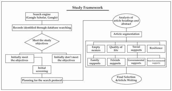 It should be noted that the empty nest stage occurs when offspring grow up and leave home, regardless of whether they live with their spouses or not [26]. Some other studies referred to them as “baby boomers” [27,28]. However, empty nesters will face various challenges and experiences due to the variations in their activities. These are mostly holding onto existing activities, expressing reluctance to engage in new activities, being unable to deal with necessary long-distance activities, losing their relatives and friends, and so forth [7]. Without support from societal forces such as family, relatives, or even friends, the empty nesters suffer different risky circumstances such as being unhappy, losing sleep, and failing to overcome difficulties [29]. These negative experiences can lead to depression, increased stress, anxiety, and other adverse symptoms, resulting in a reduced quality of life [30].