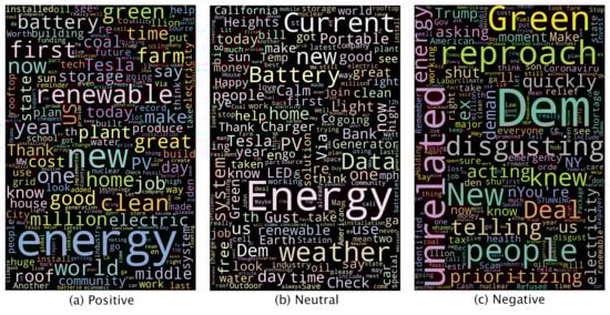 Figure 2 presents word cloud visualizations which present the most frequently appearing words in all 266,686 tweets. Of those, 119,172 tweets are classified as positive, 75,762 tweets are classified as neutral, and 71,752 tweets are classified as negative. The default stopwords (e.g., and, is, the) defined in the wordcloud library [81] are removed. The word “Solar” is also removed as every Tweet in the dataset includes “Solar.” A small number of curse and offensive words are also removed. The difference between positive, neutral, and negative classes is quite noticeable. The most common words in positive tweets include ’energy’, ’clean’, ’renewable’, ’new’, ’world’, ’battery’, ’great’, ’build’, ’house’, ’electric’, ’cost’, ’thank’, ’first’, ’job’, among others. The most frequently appearing words in neutral tweets include ’energy’, ’current’, ’weather’, ’data’, ’system’, ’battery’, ’day’, ’time’, ’check’, and ’light’. The most frequently appearing words in negative tweets include ’dem(ocrats)’, ’unrelated’, ’reproach’, ’green’, ’new’, ’deal’, ’people’, ’new’, ’telling’, ’prioritizing’, among others. These word clouds demonstrate the political nature of renewable energy development. Political events (e.g., election) and leaders (e.g., president, house representatives) appear to influence public sentiment on renewable energy significantly.