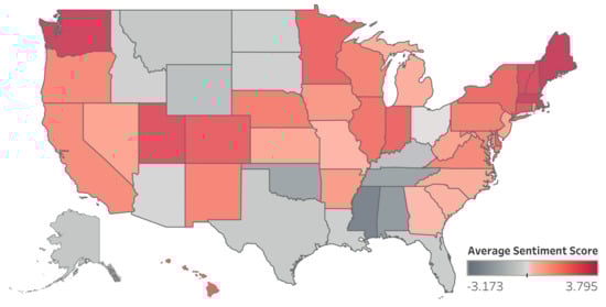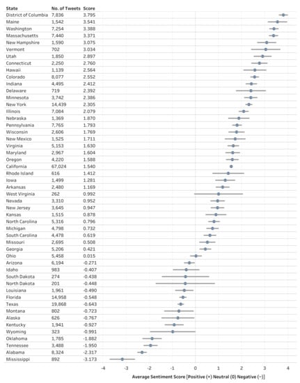 Figure 4 displays the average sentiment scores of 50 states and the District of Columbia (n = 51) between 12 January and 31 December 2020. The average sentiment score can vary from −10 (all tweets from the state are classified as “negative”) to 10 (all tweets from the state are classified as “positive”). The state average sentiment score ranges from −3.173 (Mississippi) to 3.795 (District of Columbia). The number of tweets from each state varies from 201 (North Dakota) to 67,024 (California). The 95% confidence intervals depend on the number of tweets collected from each state, resulting in larger confidence intervals for North Dakota (n = 201), West Virginia (n = 262), and South Dakota (n = 274).