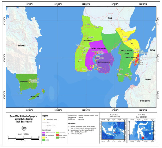 Following the characteristics of the Buton Tengah Regency area, which is dominated by karst areas, most of the water sources are in the form of springs located between the rocks. Between the rocks, which are natural containers for water storage, are small caves. These caves are generally a source of water (springs), which are widely found in the Buton Tengah Regency area. Buton Tengah Regency is known as an area with the term “a thousand caves,” so it is suspected that there are many springs scattered throughout the Buton Tengah Regency area [4]. Spring is generally a point where the ground surface and impermeable rock intersect with the water level, and water flows from an aquifer to the earth’s surface. Its occurrence is largely dependent on rock recharge characteristics, such as lithology, porosity, topsoil permeability, surface hydrogeomorphological slopes, and rainfall [5,6,7]. Springs have provided water for communities for centuries and the revival of these traditional water sources is essential for sustainable regional growth [8].