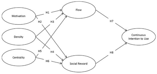 Centrality refers to how much more structurally favorable a person is in a network compared to other members in the network. Individuals with high centrality are at the center of the information flow in the network and thus have the advantage of controlling or extending the flow of communication [,]. In addition, individuals occupying high centrality are easy to access to members in the network and can obtain useful information at lower cost. In other words, the higher the individual’s centrality within a particular social network, the greater the emotional attachment to the community. This attachment affects positively the relationship with the community and the intention to use SNS []. As shown in various previous researches, users occupying the central position in the network are shown to be able to access and utilize better social capital than users with lower centrality. Therefore, it can be predicted that high individual’s centrality within the network can have a positive impact on social capital and SNS experiences and usages. In addition, the Millennials are acquiring and utilizing information by actively participating in SNS activities. Therefore, it is necessary to examine the SNS usage of this generation, focusing on the effects of motivation, density, and centrality on flow, social reward, and intention to continuous usage formed through SNS experiences.