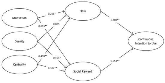 As shown in Table 5, Composite Reliability and AVE values were used to confirm reliability and validity. As a result, composite reliability of the components, including motivation, density, centrality, flow, social reward, and intention to continuous usage, were 0.922, 0.890, 0.895, 0.761, 0.899, and 0.900, respectively, and all the AVE values of the components range from 0.519 to 0.704. Therefore, it can be judged that it meets the reliability and validity criteria proposed by Hair et al. [].