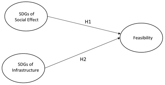 In order to test the stated hypotheses and the model, structural equation, modeling (SEM) was utilized through the Smart PLS (version 3.3.2) program. In the course of program use, firstly, the reliability tests were conducted. It was found that the reliability test results (i.e., Cronbach’s alpha > 0.60, rho_A > 0.70, composite reliability > 0.70, AVE > 0.50) were appropriate for making tests [85], which are displayed in Table 5. Discriminant validity and cross-loading correlation rates were found by using the rates of heterotrait-monotrait (HTMT). It was measured as 0.832 between SDGs of Social Effect and SDGs of Infrastructure, 0.424 between SDGs of Social Effect and Feasibility, and as 0.448 between SDGs of Infrastructure and Feasibility. The values fulfill the criteria of HTMT < 0.85 [78,85].