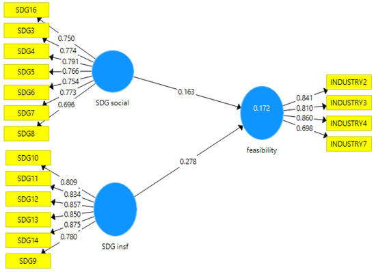 In terms of evaluating the structural model, firstly, the q2 values were determined. It was measured as 0.163 between SDGs of Social Effect and Feasibility and 0.278 between SDGs of Infrastructure and Feasibility. As the measurement was >0, the presupposition that there would be a low level impact was accepted. The R2 value was found to be 0.172, which shows that there was a low-density impact [85]. The general coherence indexes of the analysis are as follows; SRMR = 0.068, d_ULS = 0.705, d_G = 0.275, x-square = 532.933, NFI = 0.845 (accepted if >0.80) [80,81,82,83,84], and RMS theta = 0.157. The model is coherent and the detailed data regarding the model are presented in Figure 3.
