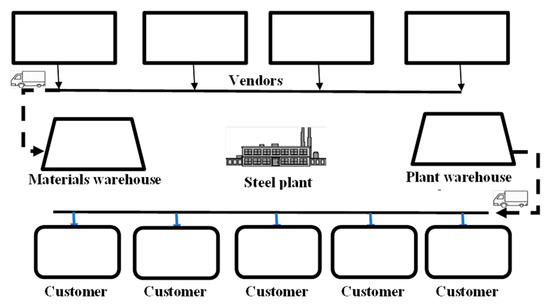 Company S is a medium-sized company (SME) in the Middle East that produces high-quality steel products (e.g., reinforcement and flat bars, angles) by recycling scrap metal, as a primary raw material, using an electric arc furnace. The molten (liquid) steel undergoes rolling and refining operations before being shaped into various types of steel products. Figure 1 depicts the supply chain of company S, which includes a number of vendors, a materials warehouse, a plant warehouse, and a steel plant. Company S sources scrap metal from various local vendors to store it in the warehouse prior to its transfer into the production unit in the steel plant. The end products are stored in a plant warehouse ready for distribution to customers.