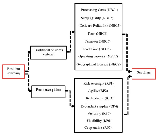 Step 1: Developing a holistic framework that presents the traditional business criteria (TBC) and resilience pillars (RPs) as shown in Figure 2. These TBC/RP are identified based on the review of the literature followed by a filtering with the purchasing team of company S. As shown in Figure 2, TBC include seven criteria: purchasing cost, scrap quality, delivery reliability, lead time, operating capacity, trust, and geographical location. The latter was added by the purchasing department because the company prefers close vendors to reduce the environmental impact.