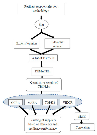 A thorough review of the literature is conducted to develop a new conceptual framework for the resilience pillars (RPs). The traditional business criteria (TBC)/RP are identified based on the literature as well as the opinion of experts (DMs from the purchasing department). The decision-making trial and evaluation laboratory (DEMATEL) method is proposed to quantify the relative importance of TBC/RP, prior to the implementation of four MCDM methods (MOTV) to validate the evaluation and ranking orders of the suppliers. Correlation among the four methods is duly assessed.