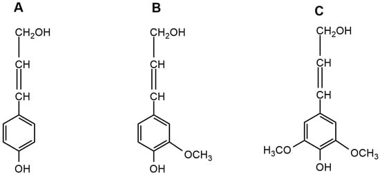 Main monolignoles found in the lignin structure. (A) p-coumaryl alcohol; (B) coniferyl alcohol; (C) sinapyl alcohol.