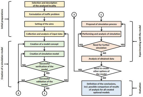 The next part concerns the creation of the simulation model itself [76,77]. The following part concerns the creation of the simulation model itself. One of the most important steps is to create a model concept. The correct methodology for model creation is selected, and the appropriate (or required) degree of abstraction of the analysed locality is determined. Then the basic traffic skeleton of the model is modelled, which can already be loaded with traffic. Only then other systems can be inserted into the model, such as public transport, pedestrian and bicycle transport systems, etc. However, it is pointless to create an excessively large model, as any small error can significantly influence the result of the simulation. We will then create our own simulation model from the conceptual model and later perform experiments on it. It is necessary to have at least basic knowledge of the relationships between generally accepted principles of modelling and their implementation in the modelling software used. Model verification means checking and verifying the functionality of the model. The functional characteristics of the model and their accuracy, compliance with physical laws, etc., are tested. It is suitable to perform the verification already during the creation of the model. The validation of the model is confirmed by the fact that the created model corresponds to the real model and provides appropriate results with the required degree of accuracy for the given purpose of the simulation study.