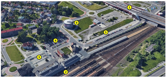 Figure 2. Analysed transit node (1) and its surroundings ((2)—train station, (3)—urban and long-distance bus stops, (4) + (5)—car park, and (6)—parking house) [78].