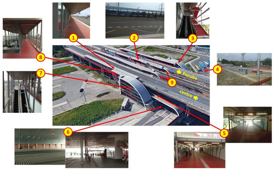 Figure 3. The analysed transit node and its parts ((1)—bus stop on the 2nd floor, (2)—view from the bus stop to the tram stop on the 2nd floor, (3)—the north staircase tower, (4)—turning bay of buses, (5)—connecting corridor on the 1st floor, (6)—bus stops on the ground floor, (7)—escalators in the south staircase tower, (8)—view on the escalators and the access to the lift on the 2nd floor, and (9)—internal staircase towers) [75,78].