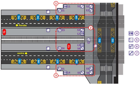 The transit node Svinov-mosty and its parts are shown in Figure 3, or schematically in Figure 4. The name of the transit node, i.e., Svinov-mosty, indicates the district Svinov and bridges (in Czech “mosty”). It is a system of two roads and two tram bridges. From the transport point of view, it is a three-floor construction. On the ground floor (i.e., at the level of the surrounding terrain), there are bus stops for urban and long-distance transport (Figure 3—position 6 and Figure 4—position D1 + D2). The first floor is located at a height of about 6 m, and it consists of a corridor under the structure of the bridges (Figure 3—position 5), into which individual staircases and escalators and lifts lead. It is therefore a kind of “pedestrian intersection”, where passengers are divided in all possible directions within this transit node. The second floor is at a height of about 10.5 m above the ground level and is located directly on the bridges. There are bus stops for urban and long-distance transport (Figure 3—position 1 and Figure 4—position H1–H8) and tram stops (Figure 3—position 2 and Figure 4—position T1+T2).