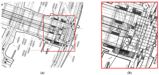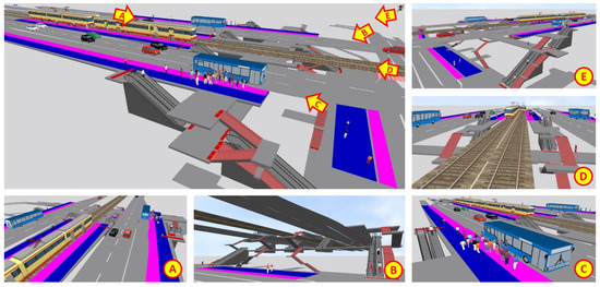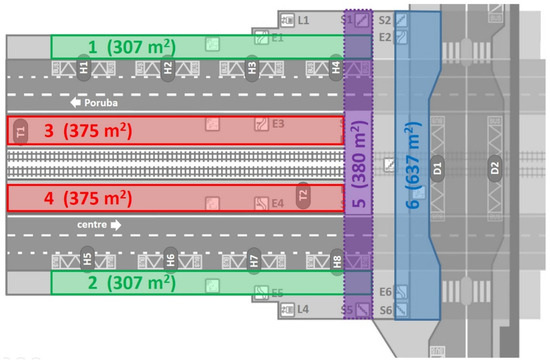 For the evaluation of the capacity of the analysed transit node, first it was necessary to determine the so-called Level of Service (LoS) of areas designated for pedestrians. For this purpose, the sizes of pedestrian areas were measured using project documentation in DWG format and using AutoCAD Civil 3D. These were the areas of bus and tram platforms, connecting the corridor and the space on the ground floor (see Figure 6, where the approximate positions of these areas are drawn).