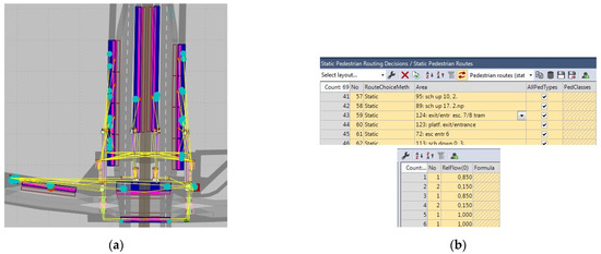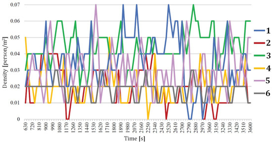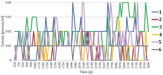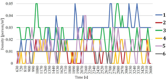 The traffic model also needed to take into account the composition of pedestrian traffic, which is closely related to walking speed. The usual walking speed of a healthy adult on a plain is about 5 km/h. However, this problem is not so clear-cut. It is necessary to take into account, for example, the proportion of older people, people with special needs, etc. The PTV VISSIM/VISWALK program uses the so-called speed distribution function, which takes into account the age of the pedestrians and their possible reduced mobility. Table 3 shows the lower and upper speed limits for the individual pedestrian classes as well as the percentages used in the analysed models. These percentages were determined on the basis of video recordings taken as a part of traffic surveys. Since transport is basically a stochastic system, these adjustments are sufficient for the needs of the described analyses. The real speed of movement of individual pedestrians is naturally influenced (usually reduced) in the model by a number of factors, e.g., avoiding obstacles and other pedestrians, taking the stairs or using escalators, etc.