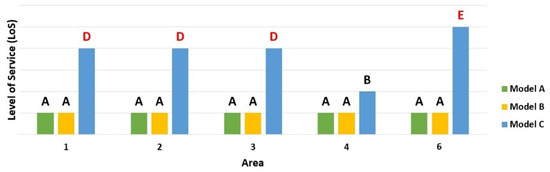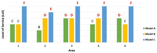 The Level of Service (LoS) for pedestrian areas is evaluated according to CSN 73 6110 [82] and is similar to the evaluation of LoS for vehicles. As with vehicles, LoS in pedestrians expresses the comfort of their movement on the road. The basic determining criterion is the pedestrian speed of movement, which is closely related to the pedestrian traffic density. With increasing volume and density of pedestrians, the speed decreases and the freedom of movement is reduced. The walking speed of approx. 2.5 km/h is unnaturally slow and corresponds to a density of 1.3–1.7 person/m2 [82]. At a density of 0.7 person/m2 and more, the speed increases to only 3.0–3.5 km/h (in this state, even slow pedestrians must reduce their speed of movement) [82]. Only at 0.25 person/m2 and less, the fastest pedestrian can reach speeds of up to approx. 6.5 km/h [82]. Further details, which will be used later in the analysis of the results from microsimulation traffic models, are given in Table 4. It describes, among other things, the individual degrees of LoS, which are marked with the letters A to F.