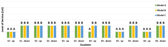 These data had to be supplemented by our own traffic surveys, which focused on the transfers of passengers between individual means of transport (or between individual floors of the transit node) during transfers from link to link. In other words, it was necessary to analyse the movements of passengers between floors, the usage of stairs, escalators and lifts, etc. For this purpose, informed people were used. They conducted the census. Video cameras were also used. Due to the large content of the obtained data, we limit the discussion to only the sample shown in Table 2. The table shows the number of passengers using stairs S1–S7 and escalators E1–E6 (see Figure 4 for designation), again during the afternoon peak hours (3 p.m.–4 p.m.), which was eventually used in a microsimulation traffic model. Greater usage of escalators is evident (compared to staircases), as due to the importance of this transit node, there are a larger number of passengers with larger luggage (suitcases, etc.). Due to the minimal usage of lifts (on average, 4 people/h per lift), the capacities of the lifts were not evaluated in the analyses.