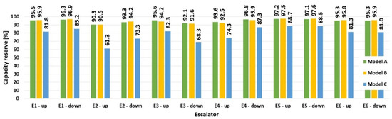 The evaluation of the capacity of the escalators then consists in the determination of the capacity reserve, which must reach at least positive values. The capacity reserve of escalators is determined from the relation