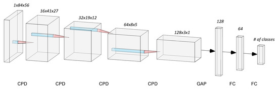 Regarding the classification units, as aforementioned, the ETi with an MLP and a 2-dimensional CNN and were deployed. It is a fact that the latest deep learning approaches can process raw waveform data [58], but the 2-dimensional topologies deliver the best balance between performance and computational cost and were selected in this case. In addition to this, the ETi method proved to be a lightweight solution for conventional feature-based classification, offering decent performance [59]. The CNN processes mel-spectrogram patches, with a shape of 84 time-steps × 56 bands. Spectral analysis is executed on a 512/256 sample size/step basis with a sampling rate of 22,050 Hz. The convolutional network consists of four consecutive CPD blocks (each one containing successive Convolutional, Pooling, and Dropout layers), a Global Average Pooling (GAP), and two Fully Connected (FC) layers with an additional Dropout layer in between. The number of filters is 16, 32, 64, and 128 for the convolutional layers with a kernel size of 3 × 3, while the pooling size is set to 2 × 2. The number of neurons of the FC layers was set to 64 and according to the number of classes, respectively. A schematic of the deployed CNN architecture is given in Figure 2. The MLP configuration takes as input 200 features, extracted in a 512/256 sample size/step basis and integrated according to the ETi method. The extracted baseline features are 12 MFCCs, Perceptual Sharpness, Perceptual Spread Spectral Centroid, Spectral Decrease, Spectral Flatness, Spectral Flux, Spectral Kurtosis, Spectral Rolloff, Spectral Skewness, Spectral Slope, Spectral Spread, Spectral Variation, and Zero Crossing Rate. These features are temporally integrated using the Mean Value, Standard Deviation, Skewness, Kurtosis, Mean Absolute Sequential Difference, Mean Crossing Rate, Flatness, and Crest Factor metrics [54]. A typical network setup was deployed with two hidden layers, featuring 64 and 32 neurons. Concerning the rest of the parameters, both networks follow the same configuration: The ReLU function was used as activation for all intermediate (Convolutional and Fully Connected) layers and SoftMax for the output layer, Categorical Cross-Entropy as the loss function, and Adam as the optimizer. Dropout was set to 25%.