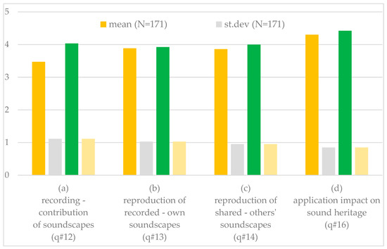Results on the probability (a) to record—contribute soundscapes (q#12); (b) to reproduce recorded (own) soundscapes (q#13); (c) to reproduce recorded (others’) soundscapes (q#14); and (d) on the estimated impact of the application in sound heritage. Statistical moments of mean and standard deviation (st.dev) are presented both for the entire population (N = 171) and the selected subset (N = 104).