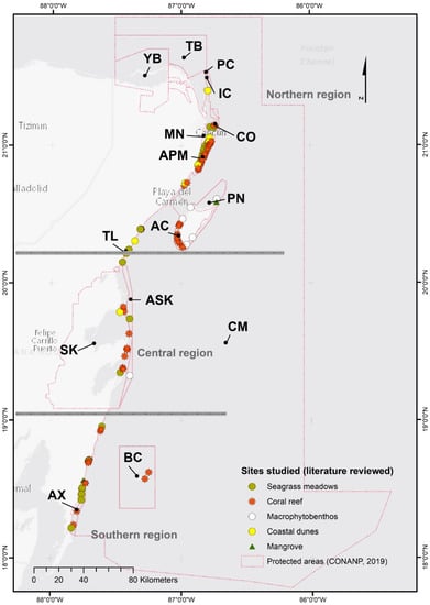 The Caribbean Sea is a unique biogeographic region, among the top five hotpots in the world for marine biodiversity. It is home to approximately 500 fish species, has 12% of the world’s reefs, and its Mesoamerican Reef System is the second largest barrier reef in the world []. The Mexican Caribbean has ≈900 km of coastline (insular and continental), with various interacting ecosystems. The environmental goods and services provided by these coastal ecosystems are numerous; provisioning (e.g., fisheries, desalinization/freshwater, timber); supporting (e.g., biodiversity services through coastal habitats); regulating (e.g., climate regulation, regulation of nutrient fluxes), and cultural (e.g., tourism, recreation, education) []. Although the Caribbean region has 15 Natural Protected Areas (NPAs) [] and nine Priority Marine Regions (PMPs) for conservation [], many of the ecosystems have been deteriorating for several decades [].