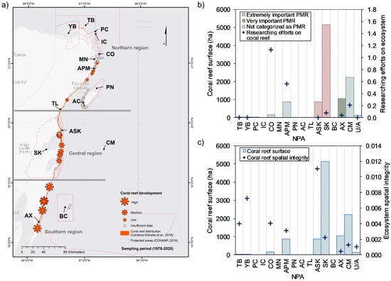 Coral reefs have a total surface of 10,536 ha in the Mexican Caribbean, of which 98.6% are within an NPA (10,389 ha). Cerdeira-Estrada et al. [] does not show coral reefs in the NPAs of AC and BC; however, there is knowledge of the area of good development. The largest area of coral reefs is in the central part of the Mexican Caribbean (6307 ha, 60%); the reefs’ northern and southern regions comprise of 19% and 21% area coral reefs, respectively (Figure 2a).