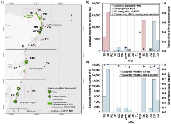 Development and surface area of seagrass meadows by region and for each NPA: (a) Development stages. (b) Surface of seagrass meadows and Research Efforts Indicator. (c) Spatial Integrity Indicator. The NPAs are listed from north to south, except for the Mexican Caribbean Biosphere Reserve (CM) and the Unprotected areas (U/A) are listed at last because they occur all along the coastline (See Table 1 for abbreviations).