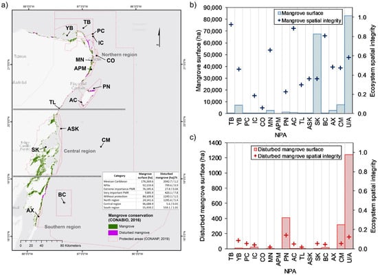 Conservation and mangroves area by region and for each NPA: (a) State of conservation. (b) Area of undisturbed mangrove and corresponding Spatial Integrity Indicator. (c) Area of disturbed mangrove and corresponding Spatial Integrity Indicator. The NPAs are listed from north to south, except for the Mexican Caribbean Biosphere Reserve (CM) and the Unprotected areas (U/A) are listed at last because they occur all along the coastline (See Table 1 for abbreviations).