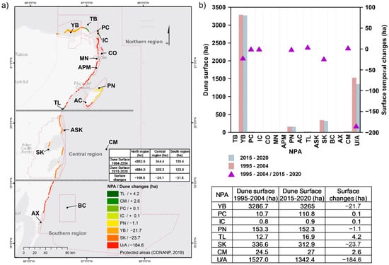 In the period 1995–2004, the Mexican Caribbean coast had 5353 ha of dunes, and this area was 5128 ha in 2015–2020, showing a 225 ha total loss in the dune ecosystems. The greatest coastal dune areas were in the north (91%), where the decrease in dune extension was also largest (169 ha). In the central region, the extension of dunes was only 6%, with a loss of 24 ha, while in the southern region the dune extension was 3%, with losses of 32 ha (Figure 5a).