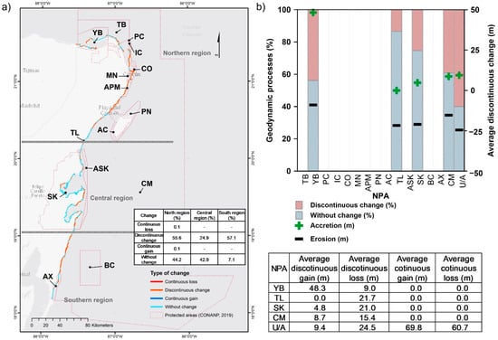 The northern region had discontinuous changes on 56% of its coastline, while that of the rest showed no changes. This was the only one that had continuous losses and gains in a minimum part of its coastline (0.2%). In the central region, the discontinuous changes were 25% and without changes of 43%. Finally, the greatest discontinuous changes were in the southern (57%), while was 7% without changes (Figure 6a).