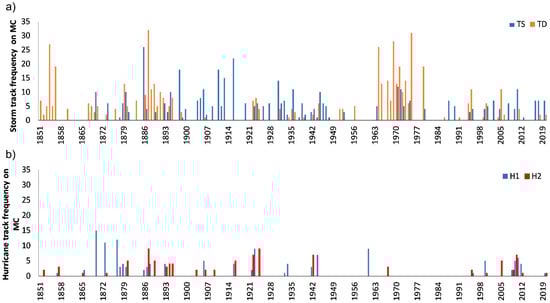 Frequency of extreme meteorological events passing through the Mexican Caribbean, 1851–2020: (a) Tropical Depressions and Tropical Storms; (b) Hurricanes of categories H1 and H2.