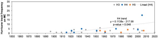 High category hurricanes (H3 and higher) started to affect the Mexican Caribbean in 1896 (H3), in 1915 (H4) and 1955 (H5). Only 13 H5 hurricanes were recorded over the 170 years analysed, all within a 52-year interval (1955 to 2007) but showing no trend of statistical significance. H3 hurricanes showed no trend of statistical significance, although there was an increasing trend in H4 hurricanes passing through the Mexican Caribbean (p-value < 0.005 and Sen’s slope of 0.062). There was no clear trend for other category hurricanes, although the sum of H4 and H5 passing through the area did show an increase, with a p-value of 0.030 and a Sen slope of 0.036 (Table 5 and Figure 8).